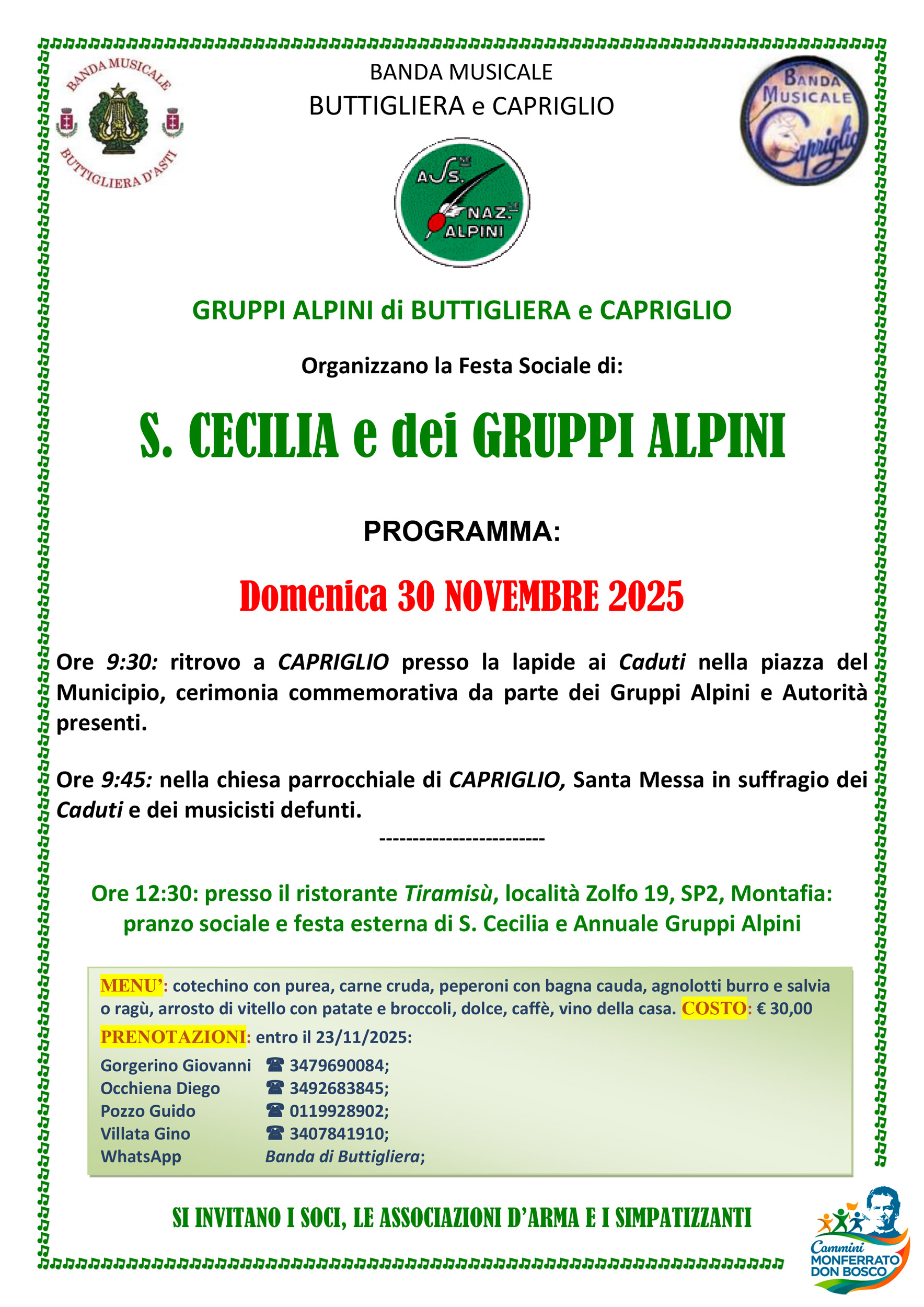 I Gruppi Alpini di Buttigliera e Capriglio organizzano la Festa Sociale di Santa Cecilia e dei Gruppi Alpini.