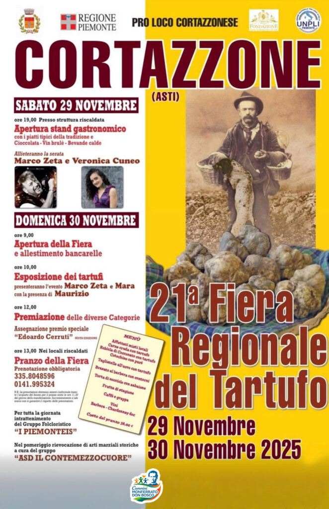 Nel weekend del 29 e 30 novembre avrà luogo nel comune di Cortazzone a 21° Fiera Regionale del Tartufo, con stand gastronomico, bancarelle, esposizione e premiazione dei tartufi nelle specifiche categorie.