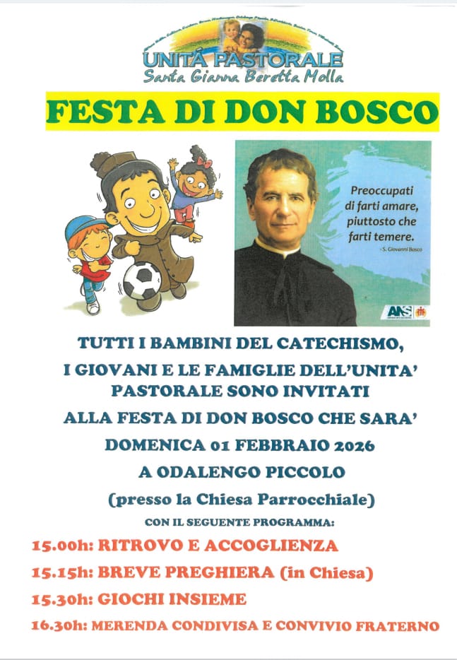 Tutti i bambini del catechismo, i giovani e le famiglie dell’Unità Pastorale Santa Gianna Beretta Molla sono invitati alla Festa di Don Bosco, che avrà luogo domenica 1° febbraio 2026 a Odalengo Piccolo con il seguente programma: