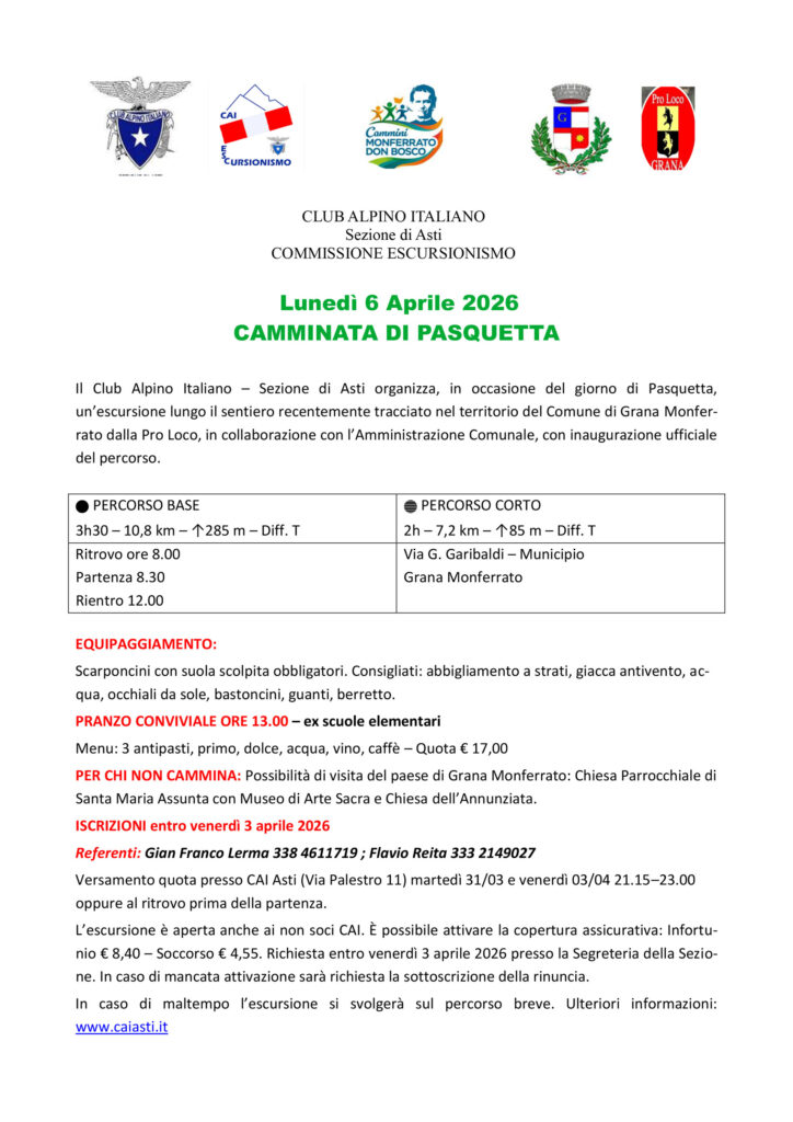 Il Club Alpino Italiano – Sezione di Asti organizza, in occasione del giorno di Pasquetta, un’escursione lungo il sentiero recentemente tracciato nel territorio del Comune di Grana Monferrato dalla Pro Loco, in collaborazione con l’Amministrazione Comunale, con inaugurazione ufficiale del percorso.